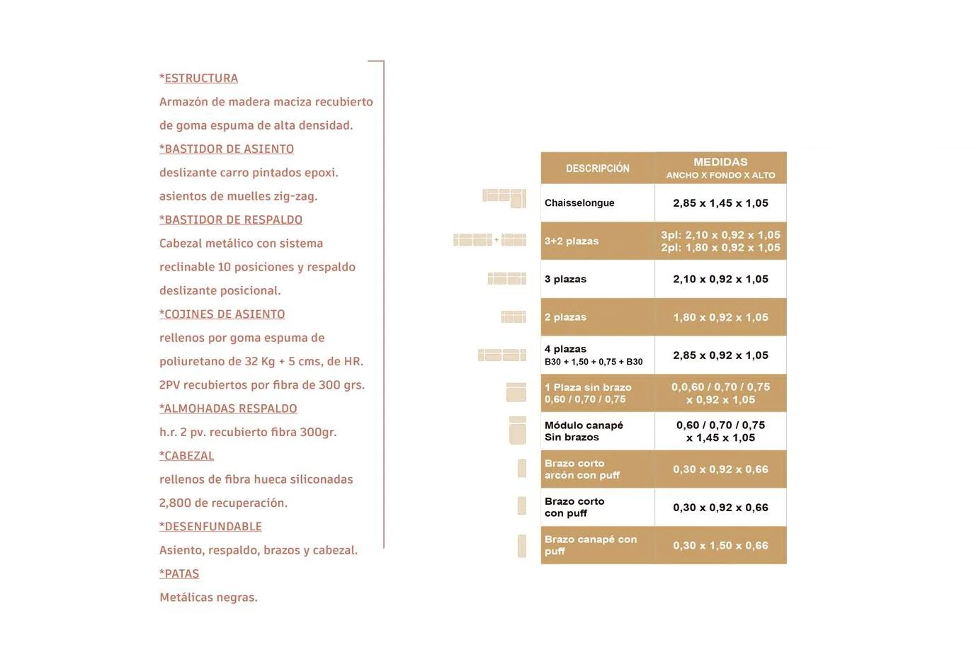 - Estructura: madera maciza recubierta con gomaespuma de alta densidad.