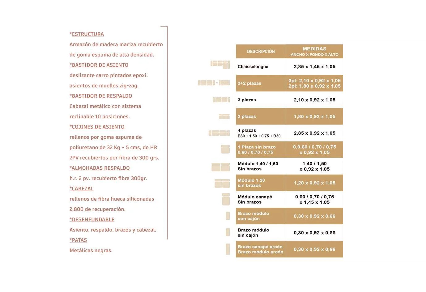 - Estructura: armazón de madera maciza recubierta con gomaespuma de alta densidad.